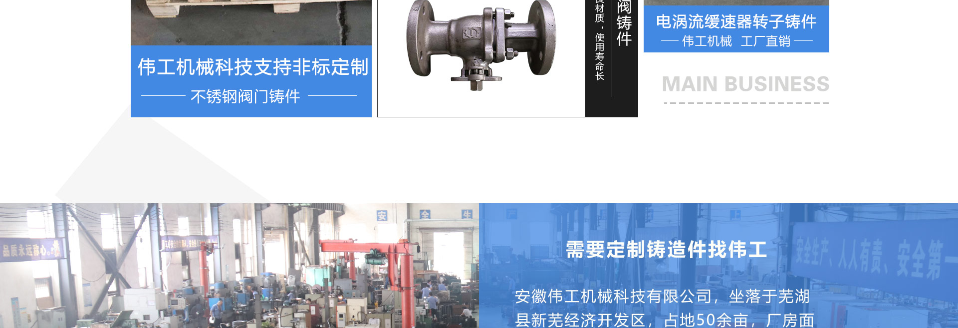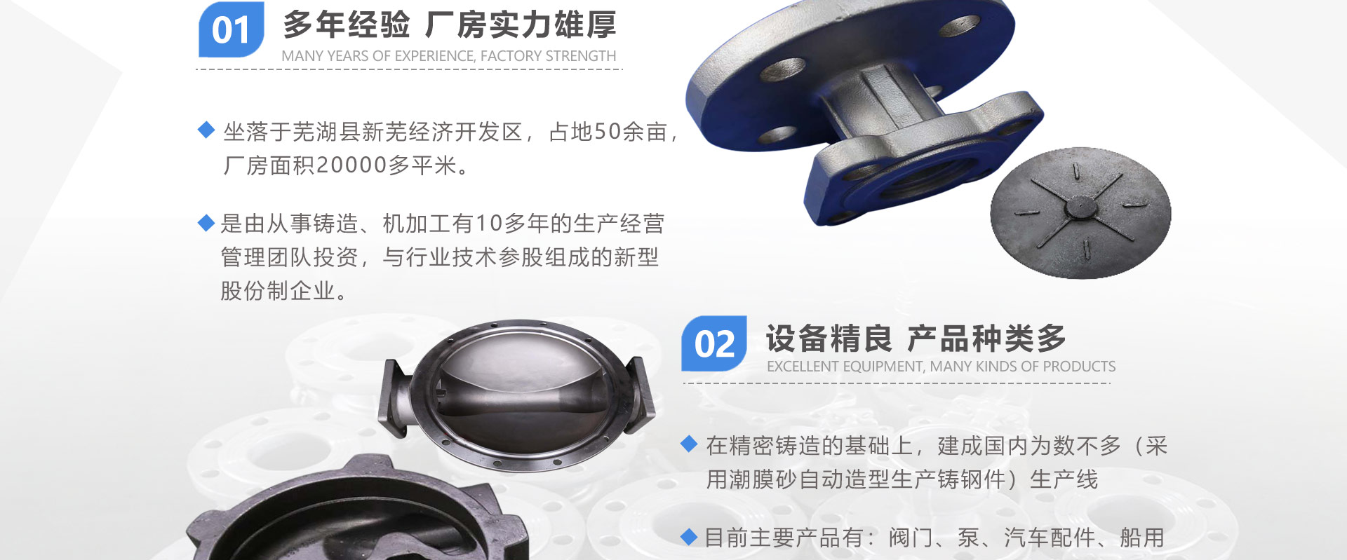 安徽偉工機械科技有限公司,坐落于安徽蕪湖新蕪經(jīng)濟(jì)開發(fā)區(qū),是一家専業(yè)從事鑄造產(chǎn)品設(shè)計、研發(fā)、生產(chǎn)、銷售于一體的企業(yè),公司為客戶的產(chǎn)品提供多樣的技術(shù)支持與設(shè)計,公司主要鑄造技術(shù)有潮模砂鑄造、硅溶膠精鑄工藝。主要產(chǎn)品有:不銹鋼閥門配件、泵閥配件、汽車配件、工業(yè)管道配件、工程機械配件、汽車配件等。材質(zhì)為:低合金鋼、304、316、316L、鉻鉬鋼、哈氏合金、碳鋼、雙相鋼等。公司已先后通過ISO9001和TS16949等多種體系審核,以完備的管理手段和齊全的檢測設(shè)備滿足客戶需求,進(jìn)的設(shè)備,専業(yè)的技術(shù),嚴(yán)謹(jǐn)?shù)墓芾?,穩(wěn)定的質(zhì)量。服務(wù)客戶,鑄造未來,偉工誠摯的歡迎新老客戶共同商洽合作